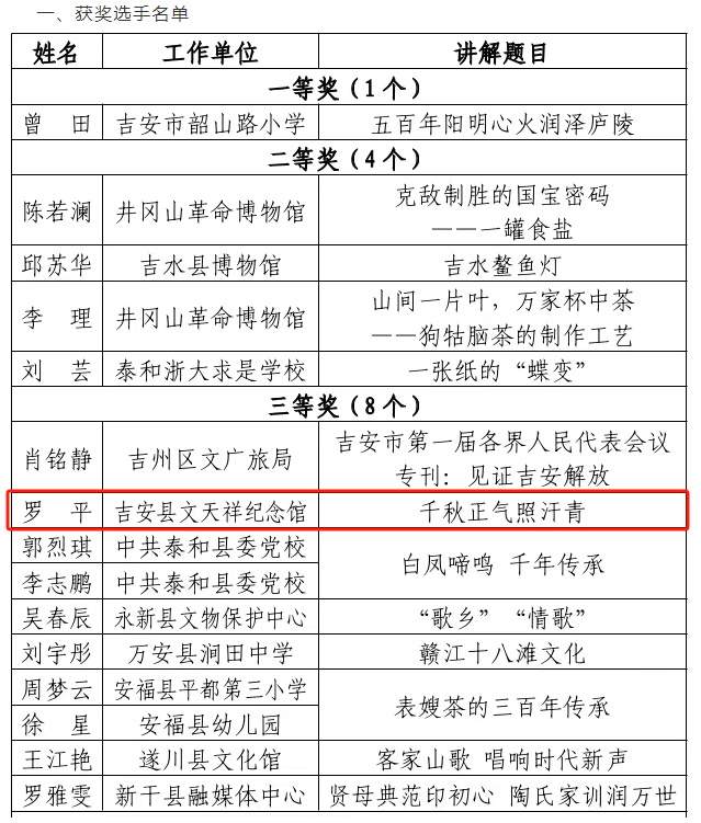 6月20日,我馆讲解员罗平在吉安市第三届吉安优秀传统文化讲解比赛获得“三等奖”。本次比赛由吉安市社科联主办、井冈山大学庐陵文化研究中心、吉安幼儿师范高等专科学校协办。比赛分为自主命题讲解和评委问答两个环节,全市各行业40位选手参加了角逐。罗平以《千秋正气照汗青》为主题,凭借扎实的专业功底、出色的讲解水平,声情并茂的讲述了民族英雄文天祥可歌可泣的英雄人生。